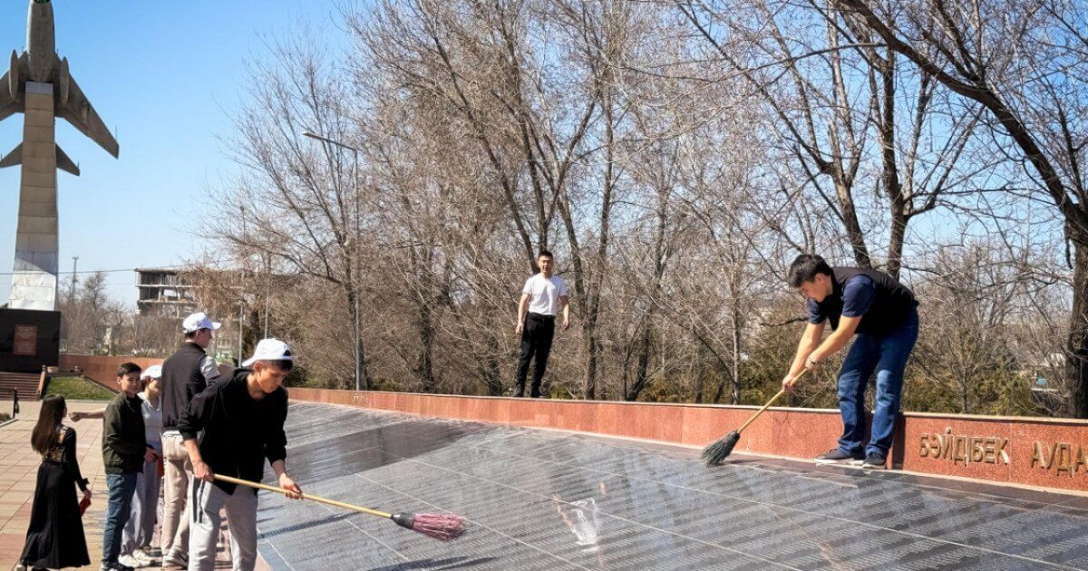 А в Шымкенте порядка 50 активистов молодежного крыла Жастар Рухы провели генеральную уборку в парке Абая на территории памятника героям Великой Отечественной войны Мемориал Славы. Это целый комплекс, в который входит обелиск Данк – символ единения фронта и тыла, вечный огонь, Круг Героев – с именами 51 воина, уроженцев региона, удостоенных звания Героя Советского Союза и восьми полных кавалеров Ордена Славы. Аллея Славы, по обеим сторонам которой – 200-метровые плиты, с высеченными на них именами более 140 тысяч уроженцев Шымкента и Туркестанской области – солдат Великой Отечественной войны.