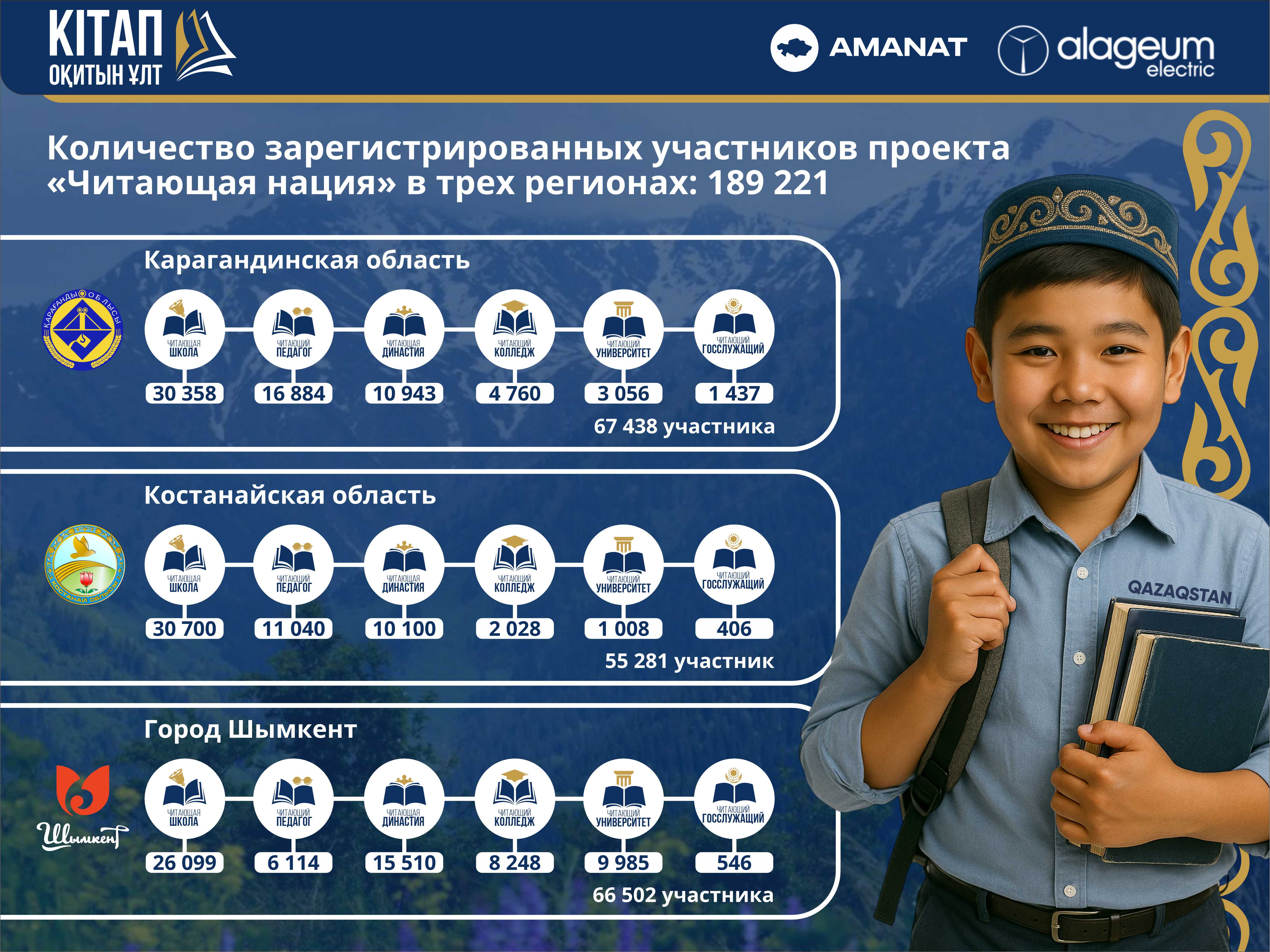 За месяц в трех регионах для участия в проекте зарегистрировались 189 221 участник: Карагандинская область – 67 438 участников, Костанайская область – 55 281 участник, г. Шымкент – 66 502 участника.