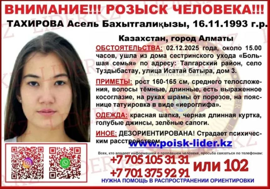 По имеющейся информации, 2 декабря 2025 года около 15:00 Асель ушла из дома сестринского ухода “Большая семья”, расположенного в Талгарском районе, село Туздыбастау, и с тех пор ее местонахождение неизвестно.