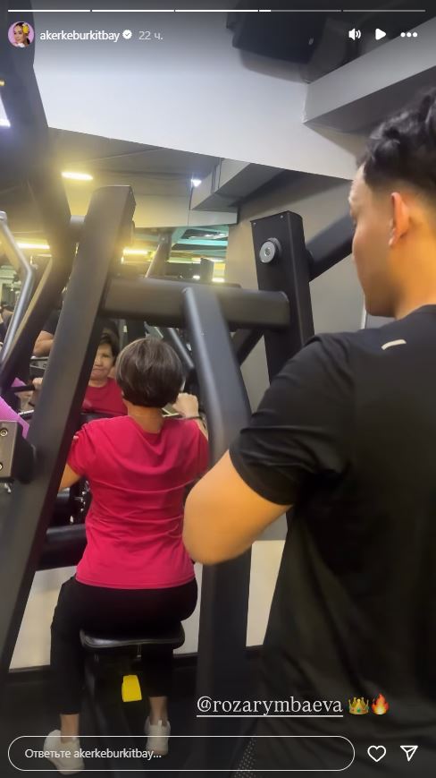 На видео запечатлены ее супруг, певец Али Окапов и его мама, народная артистка Казахстана Роза Рымбаева. Она выполняла упражнения на спину и руки под присмотром фитнес-тренера.