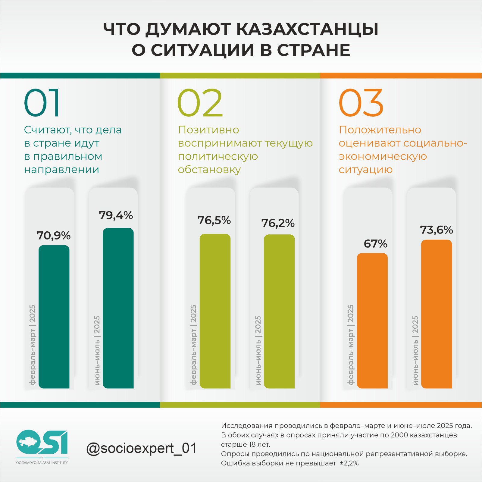 Июньский замер Института общественной политики партии AMANAT показал, что оценки развития страны остаются стабильными. Как отмечается в сообщении, это свидетельствует о сохраняющемся общественном консенсусе относительно выбранного курса и устойчивости социальных настроений. Большинство респондентов (79,4%) считают, что страна движется в правильном направлении, передает Liter.kz.