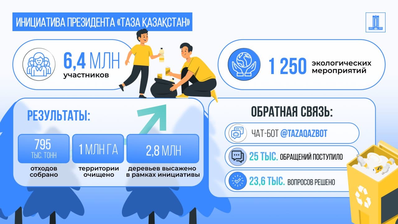Министр сообщил, что утвержденная по инициативе президента Концепция “Таза Қазақстан” на 2024-2029 годы придала новый импульс экологическому движению в стране. В текущем году проведено 1250 мероприятий, в которых приняли участие 6,4 млн человек. Совместными усилиями очищено более 1 млн га территории, собрано 795 тыс. тонн отходов и высажено 2,8 млн деревьев.