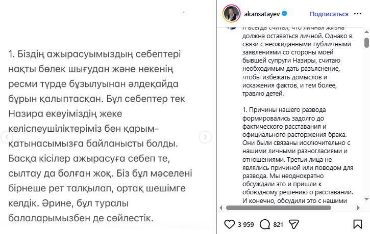В завершение Акан Сатаев подчеркнул, что никогда не препятствовал и не препятствует общению детей с матерью, а также заявил, что все ранее оговоренные обязательства им выполнены.