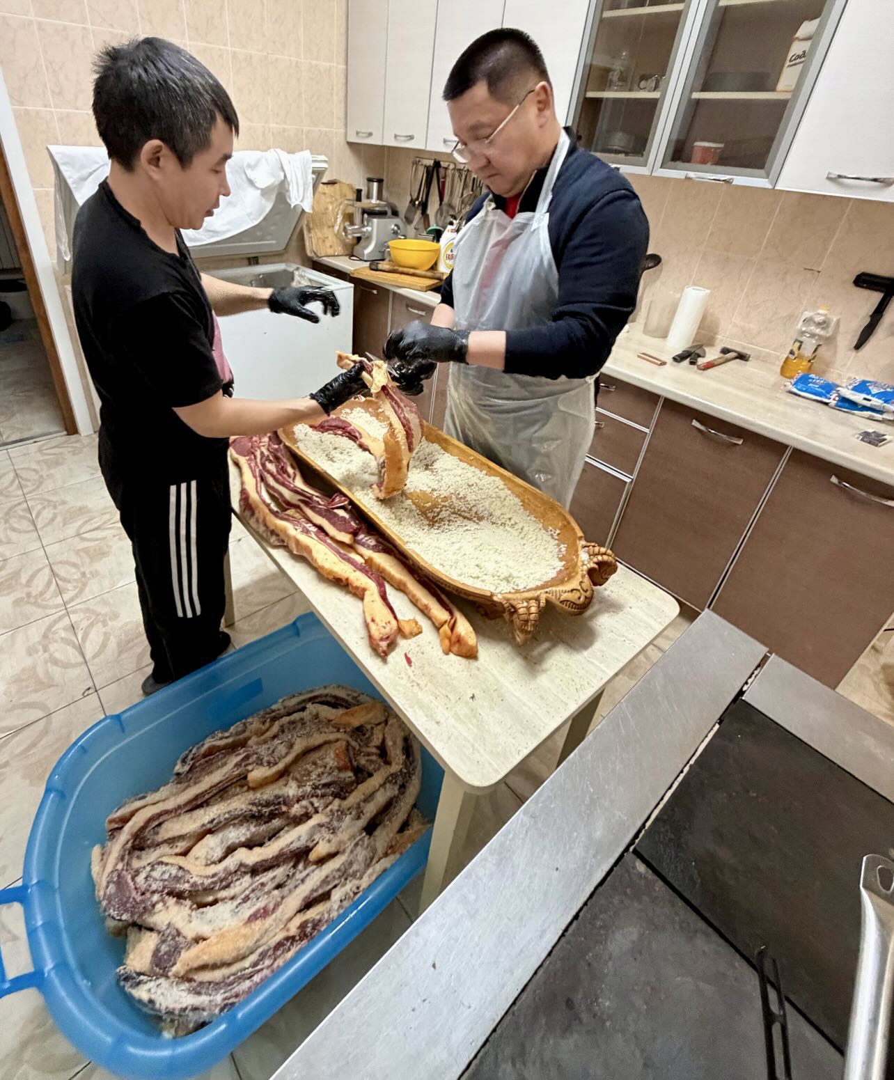 В своем аккаунте в Threads Асаин Байханов опубликовал домашнее фото, на котором заснято, как он занимается разделкой соғыма.