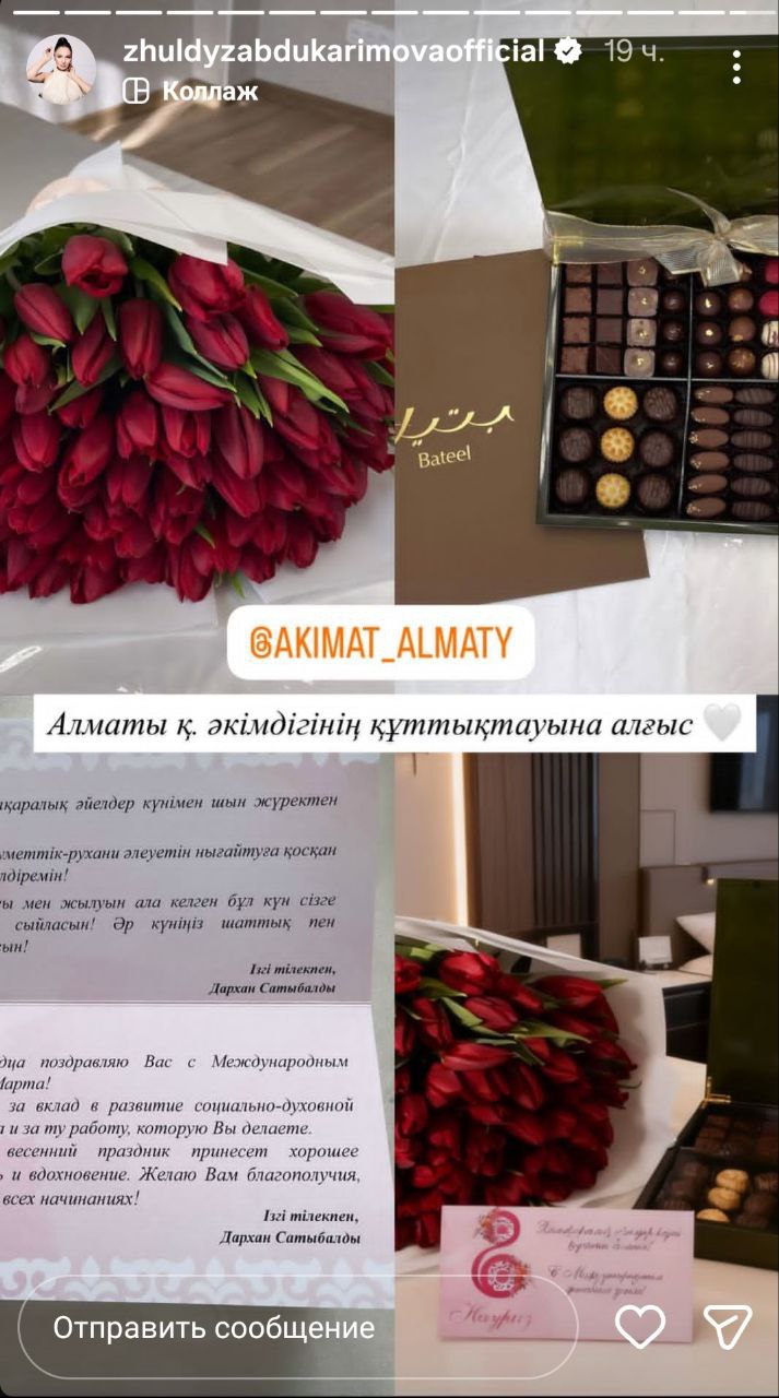 Казахстанская актриса Жулдыз Абдукаримова поделилась с поклонниками, как акимат Алматы поздравил ее с Международным женским днем, передает Liter.kz.