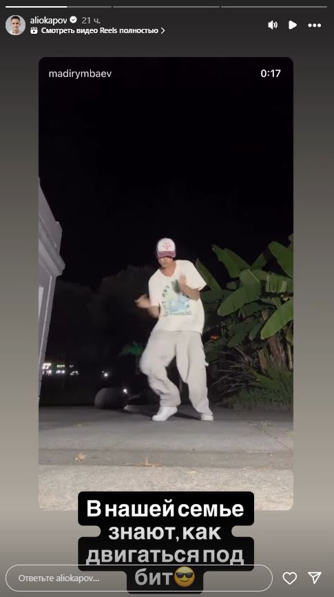 Мади Рымбаев опубликовал видео под свою песню “Baiqamaisyn ba?”. Яркие движения и харизма исполнителя не остались без внимания и со стороны Али Окаповa. Он сделал репост танца Мади, подметив, что у них в семье это прирожденное: