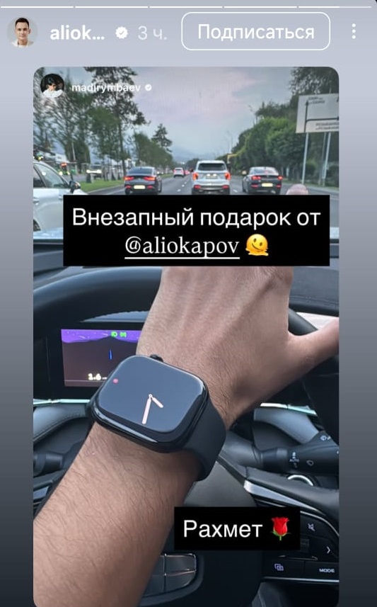 Мади Рымбаев опубликовал в сторис фото, на котором заснята рука на руле, а на ней умные часы Apple Watch черные с черным ремешком.