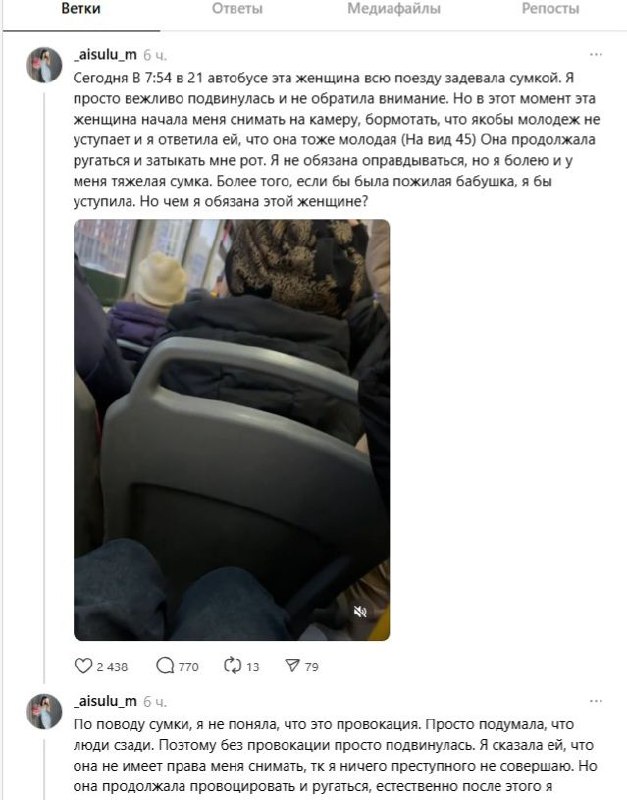 Позже в автобус действительно зашла пожилая женщина, которая вежливо попросила место, и автор публикации подчеркнула, что именно такие просьбы она считает корректными.