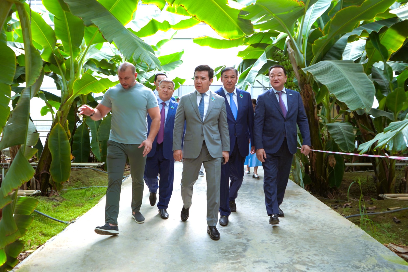 Депутаты побывали в тепличном комплексе ТОО “Gen Group Kazakhstan” в селе Таскешу Кайнарбулакского сельского округа, где выращивают бананы. На площади 5,3 га в рамках одного из первых в СНГ проектов по адаптации тропических культур налажено выращивание бананов. Здесь ежегодно производят до тысячи тонн продукции, обеспечивая отечественный рынок. По словам директора комплекса Тимура Утешева, первая очередь проекта, стартовавшая в 2023 году, обошлась в 1,056 млрд тенге. Все оборудование поставлено из Турции. Сейчас в комплексе работают 15 человек на постоянной основе, еще 15 привлекаются на сезонные работы.