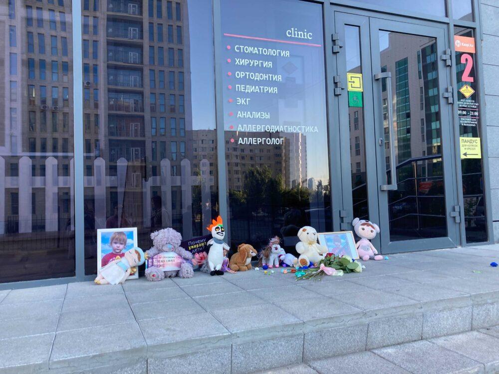 Сегодня, 26 июня 2021 года, к стоматологии, где скончалась трехлетняя Алиса, астанчане несут цветы и игрушки. Этим стихийным мемориалом, который изначально организовала семья девочки, они хотят привлечь внимание общественности.