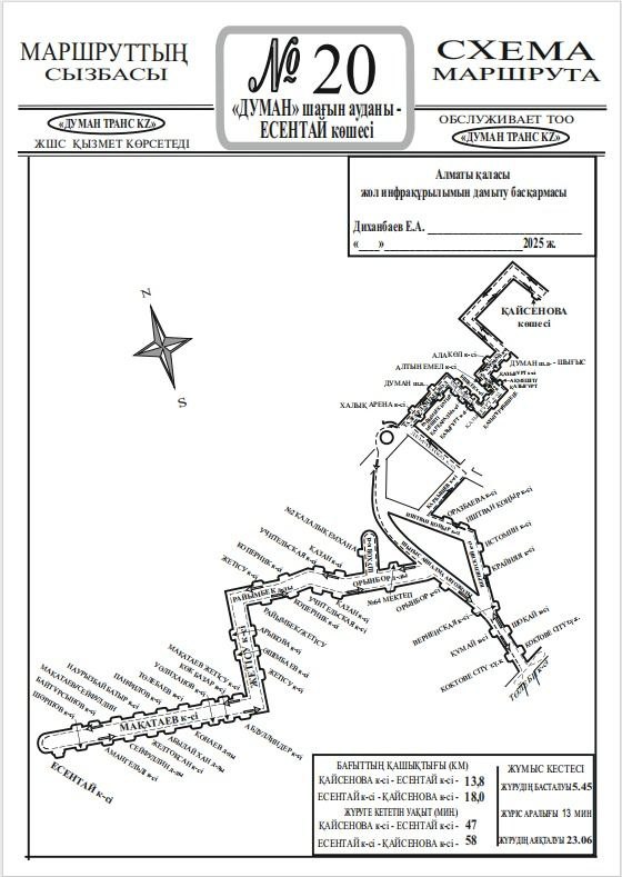 Согласно обновленной схеме, маршрут №20 будет начинать движение от остановки “Улица Кайсенова” и далее следовать по: