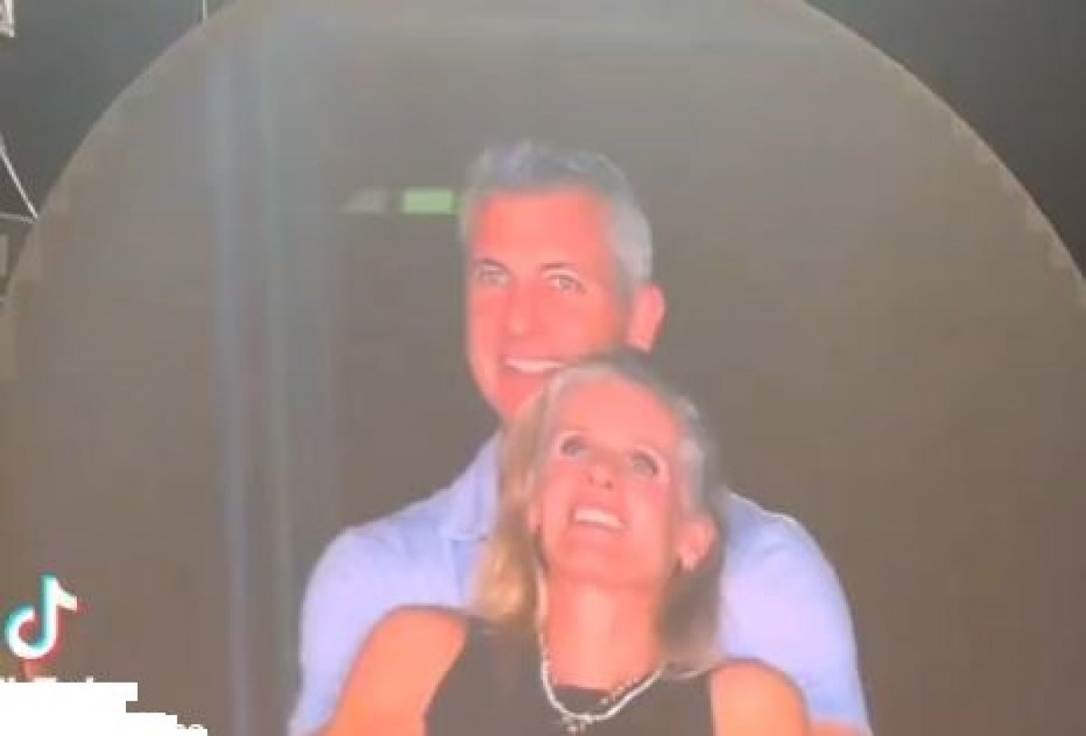 На кадрах видно, как мужчина и женщина обнимаются, но резко отстраняются, когда замечают, что попали на большой экран.