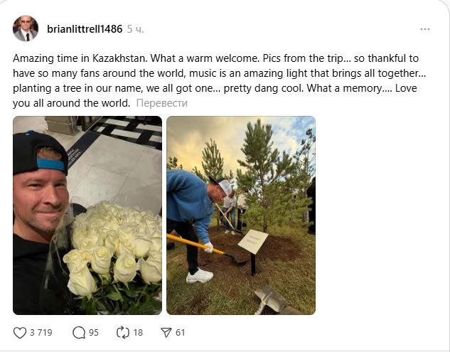 Участник бойз-бенда Брайан Литтрелл в своем аккаунте в Treads опубликовал пост, в котором поблагодарил казахстанцев: