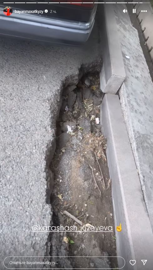 В своих социальных сетях она опубликовала видео, снятое на пересечении улиц Жубанова и Утегенова. На кадрах Баян демонстрирует большую яму на проезжей части, в которую провалился даже бордюр, и с возмущением комментирует ситуацию.