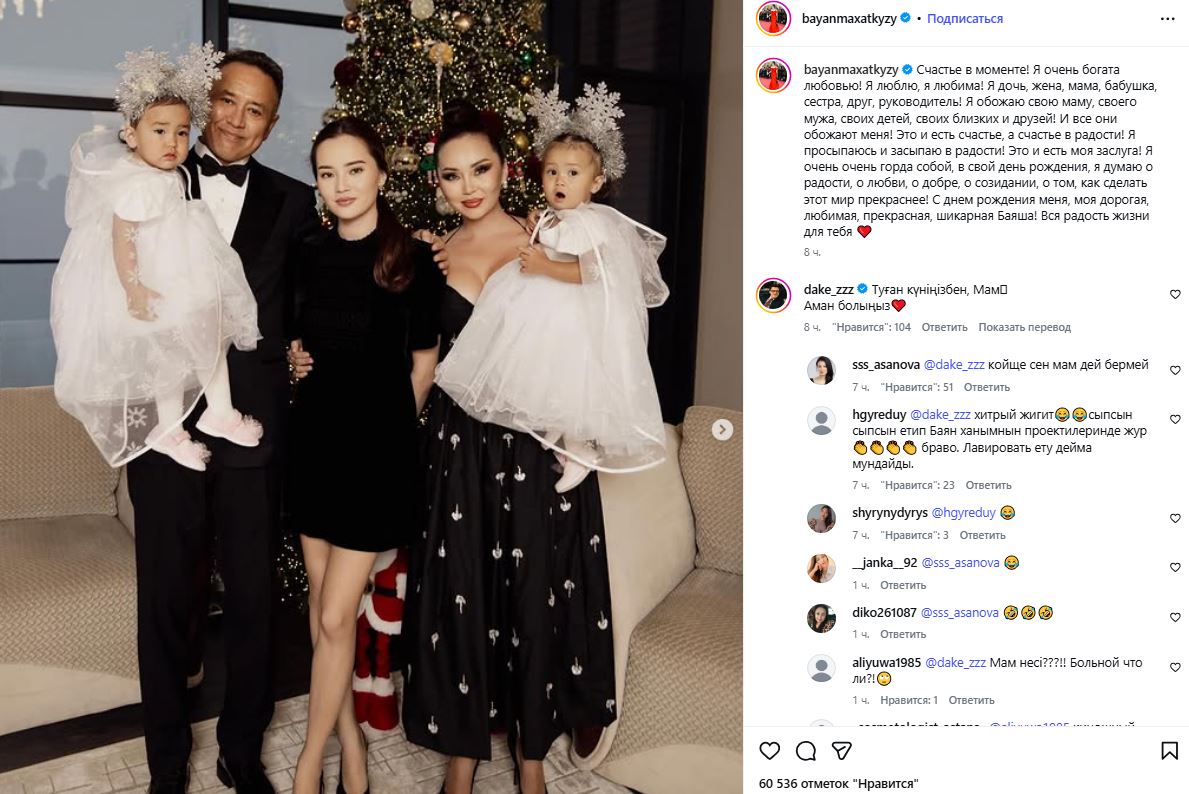 “Счастье в моменте! Я очень богата любовью! Я люблю, я любима! Я дочь, жена, мама, бабушка, сестра, друг, руководитель! Я обожаю свою маму, своего мужа, своих детей, своих близких и друзей! И все они обожают меня! Это и есть счастье, а счастье в радости! Я просыпаюсь и засыпаю в радости! Это и есть моя заслуга! Я очень очень горда собой, в свой день рождения, я думаю о радости, о любви, о добре, о созидании, о том, как сделать этот мир прекраснее! С днем рождения меня, моя дорогая, любимая, прекрасная, шикарная Баяша! Вся радость жизни для тебя”, – написала она.