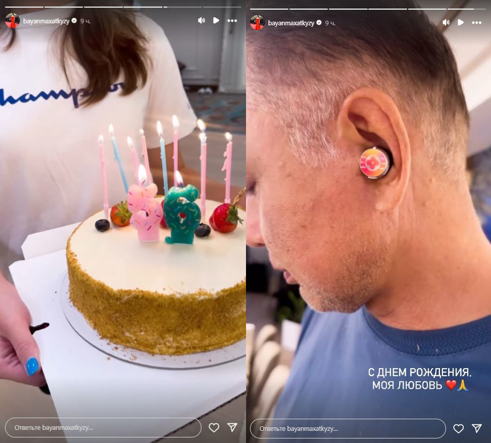 В Instagram-stories Баян опубликовала видео, на котором ее дочь Айару держит в руках торт с зажженными свечками и цифрой 56. Также в кадре мама Алагузовой и сам именинник – Турсен.