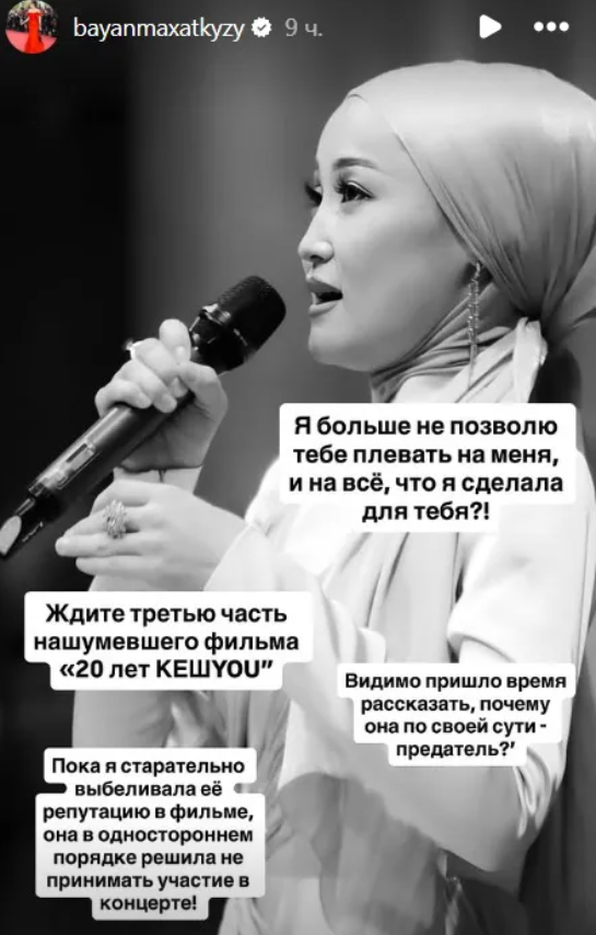 "Я больше не позволю тебе плевать на меня и на все, что я сделала для тебя! Видимо, пришло время рассказать, почему она по своей сути предатель? Ждите третью часть нашумевшего фильма "20 лет “КешYOU". Пока я старательно выбеливала ее репутацию в фильме, она в одностороннем порядке решила не принимать участия в концерте!"