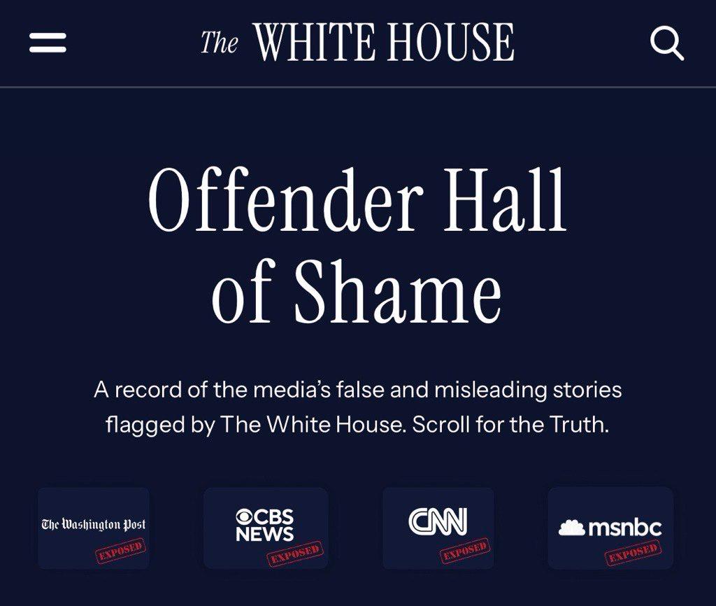 Раздел оформлен как настоящая “система наказаний” для прессы. Внутри размещены категории: “медиа-преступник недели”, “доска позора”, “таблица лидеров” и даже “рецидивисты” – то есть те, кто, по версии Белого дома, неоднократно публиковал недостоверные материалы.