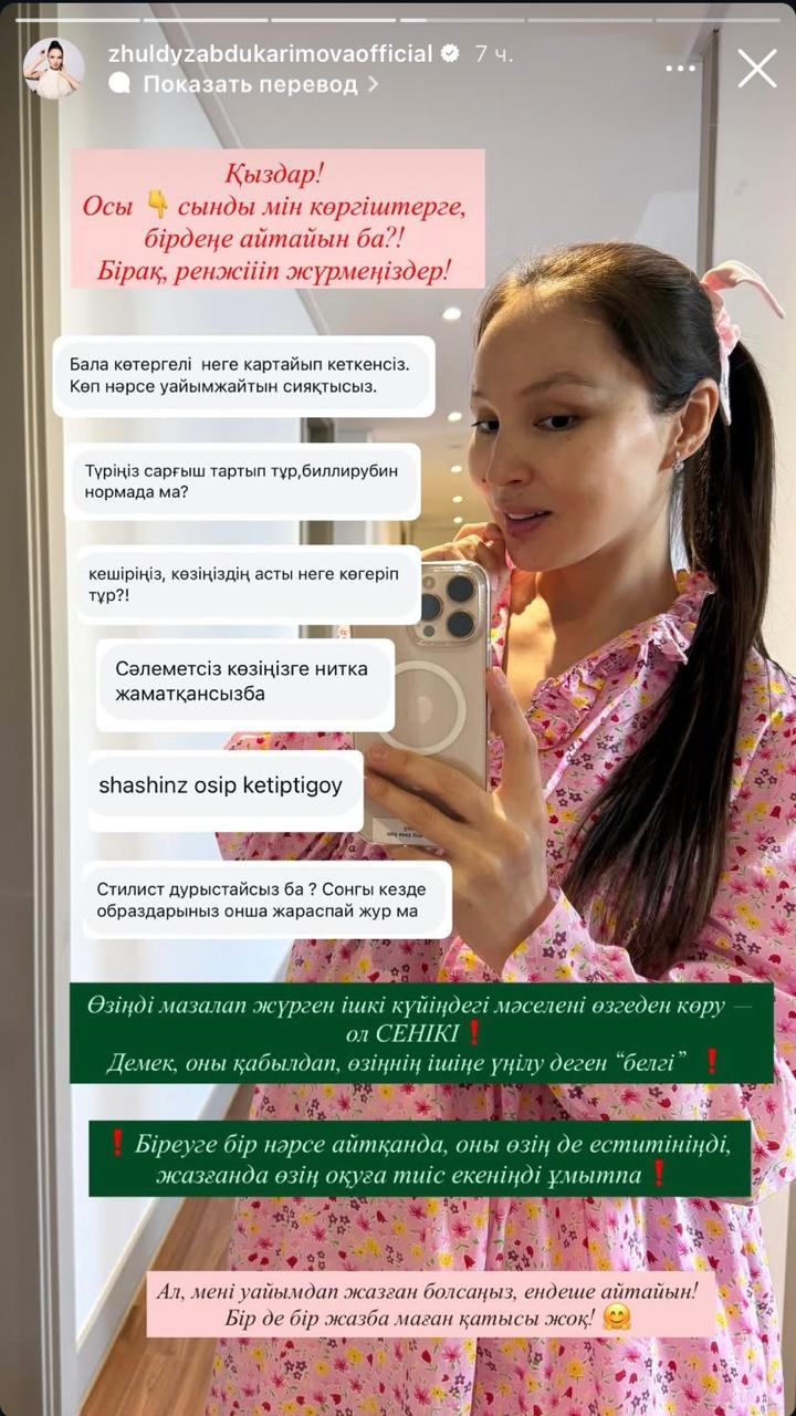Сама Жулдыз не стала вступать в споры, никого не осудила. Она просто выложила скриншот, оставив подписчикам возможность самим подумать: почему людям так легко осуждать женщину, которая ждет ребенка?