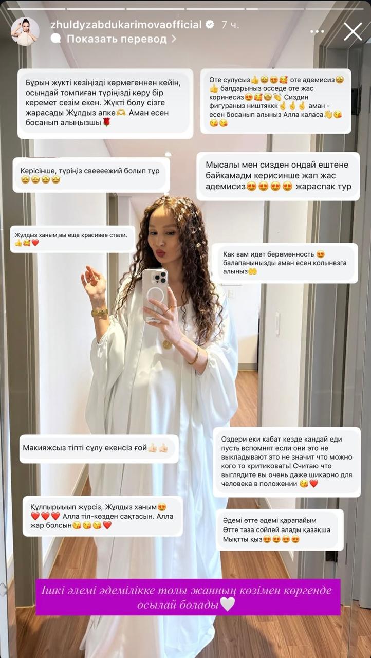 “Беременность вам невероятно идет. Пусть Аллах поможет родить легко и благополучно”; “Вы и без макияжа прекрасны”; “Сияете, Жулдыз ханым! Настоящая звезда”; “С такой фигурой после четверых детей – вы просто чудо!”; “Даже беременной вы выглядите моложе многих”,– пишут поклонники.