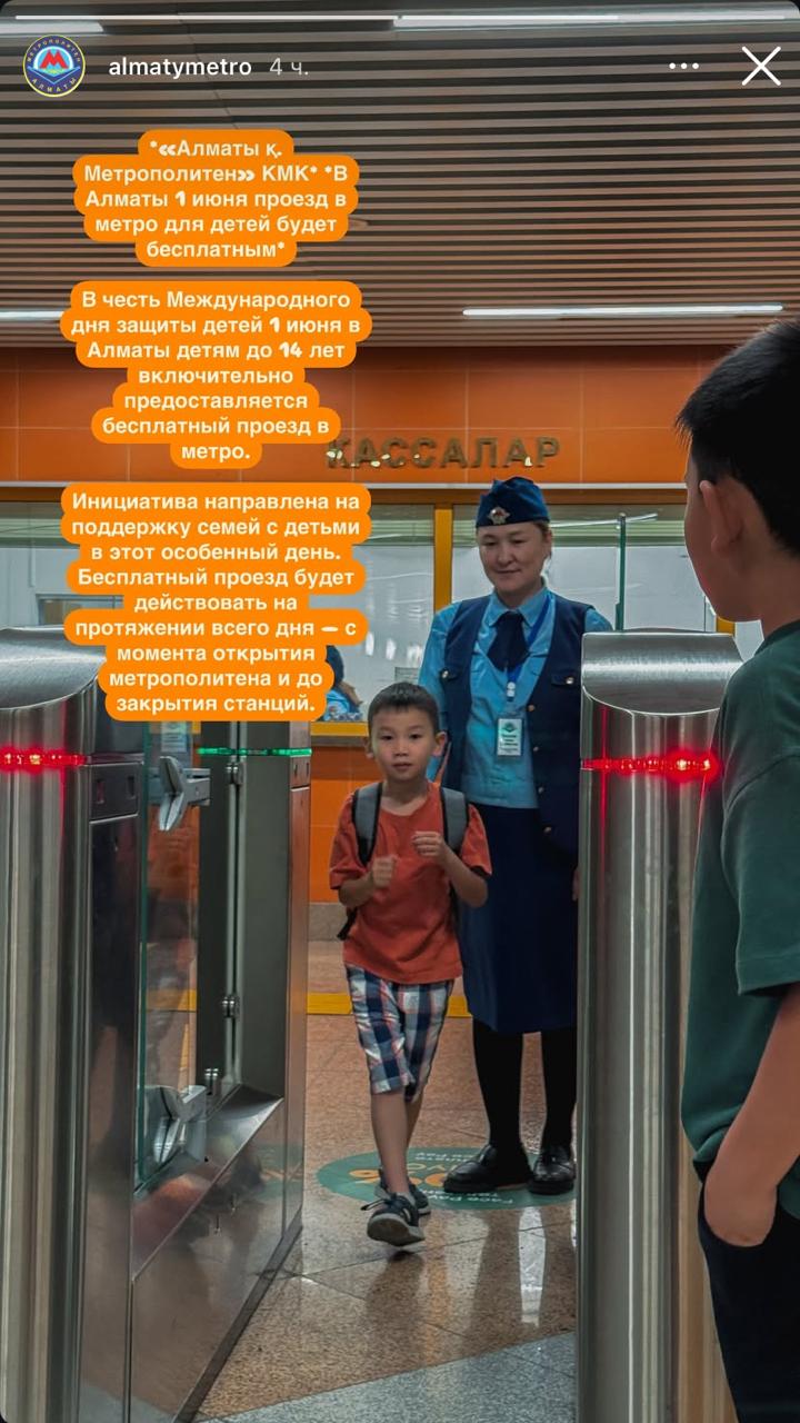 В воскресенье, 1 июня 2025 года, в Алматы в честь Международного дня защиты детей для всех, кому нет 14 лет включительно, будет действовать бесплатный проезд в метро. Об этом сообщили в КГП “Метрополитен города Алматы”, передает Liter.kz.