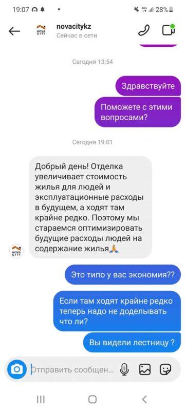 "Добрый день! Отделка увеличивает стоимость жилья для людей и эксплуатационные расходы в будущем, а ходят там крайне редко. Поэтому мы стараемся оптимизировать будущие расходы людей на содержание жилья", - ответили Рамилю Кожабаеву представители ЖК Nova City в Instagram (прилагаем скриншот переписки).