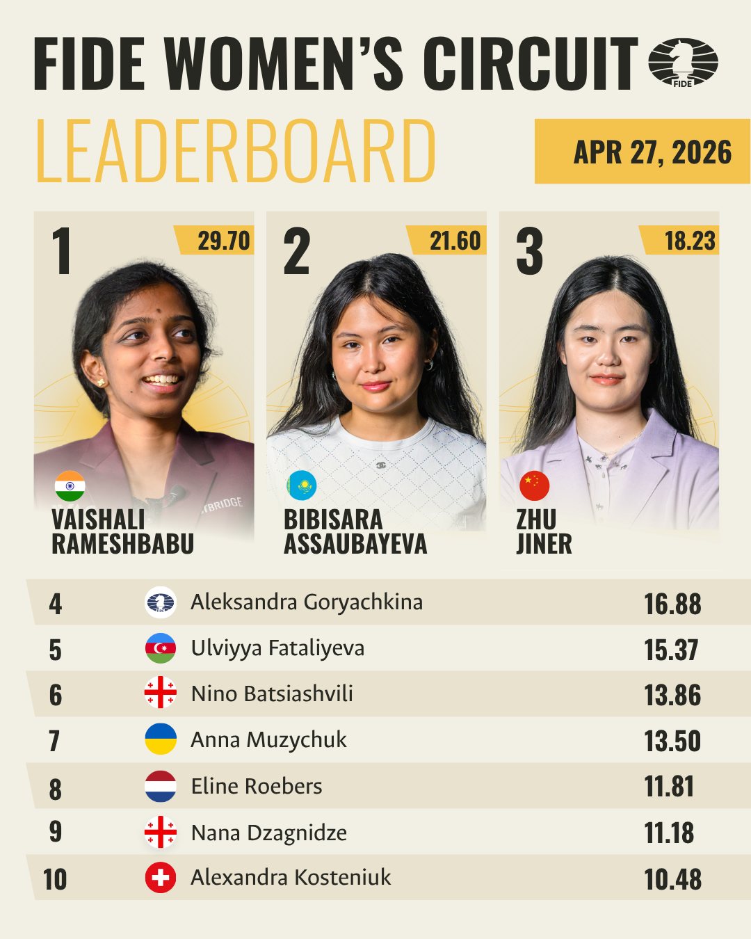 В женском зачете FIDE Women’s Circuit 2026-27 также произошли серьезные сдвиги в лидирующей группе после женского Турнира претендентов и IV Международного женского турнира в Узбекистане.