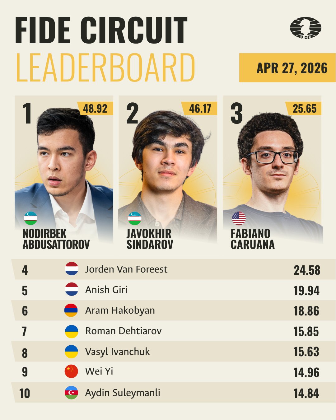 Нодирбек Абдусатторов, не игравший в классические шахматы с начала марта, сохранил свое лидерство, однако Жавохир Синдаров после триумфа на Кипре отстает от него всего на 2,75 очка. В первую десятку зачета также вошли призеры богатого на очки Турнира претендентов – Аниш Гири и Фабиано Каруана, а также Вэй И.