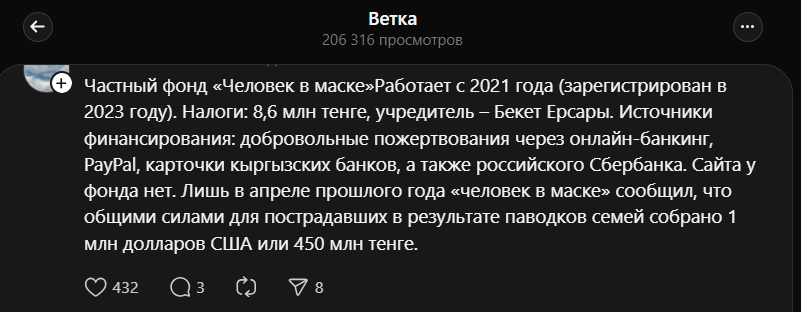 Слухи и догадки подкрепляются и фактами о самом фонде. По данным пользователей, частный фонд “Человек в маске” действует с 2021 года, официально зарегистрирован в 2023-м. Налоги фонда составляют 8,6 млн тенге. Финансирование происходит через добровольные пожертвования онлайн, PayPal, карточки кыргызских банков и российского Сбербанка. В апреле прошлого года “Человек в маске” сообщил о сборе 1 млн долларов для пострадавших от паводков.