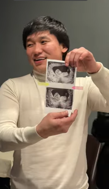 Под одеждой находилось УЗИ, которое открыло Кайрату долгожданную новость о пополнении в семье. Певец не верит своим глазам, спрашивает, правда ли это, и поочередно целует и обнимает всех близких.