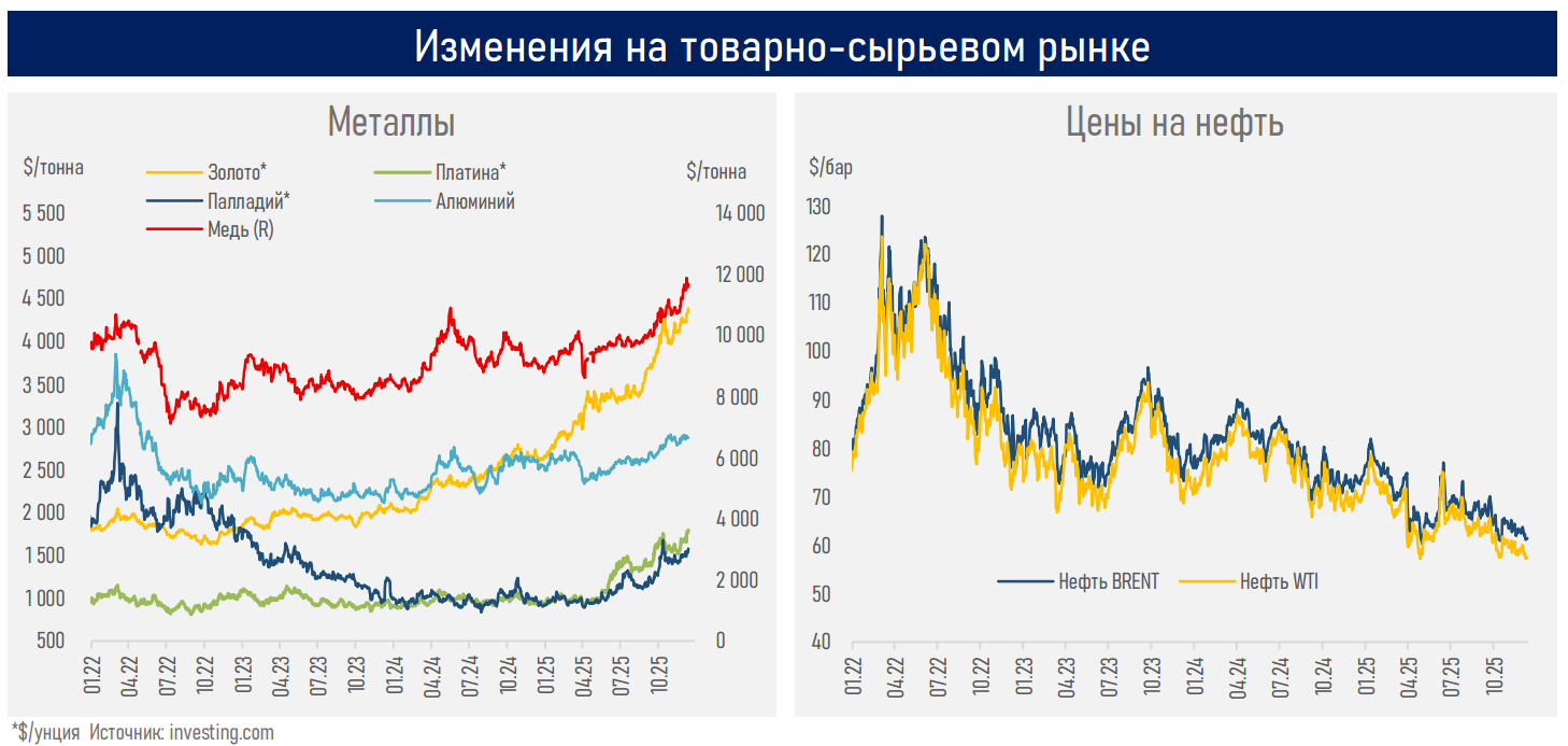 Изменения на товарно-сырьевом рынке в течение года сложились разнонаправленно, но сейчас цены на нефть завершают год глубоким двузначным снижением (-18%) на опасениях о переизбытке предложения сырья со стороны ОПЕК+ и США. В тоже время цены основных биржевых металлов, напротив, показали двузначный рост (+97% на платину, +73% на палладий, +66% на золото), отражая структурные ограничения предложения и сохраняющуюся геополитическую напряженность.