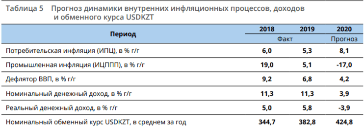 Согласно прогнозу AERC, условия которого были представлены выше, курс доллара США к тенге в среднем за 2020 год сложится около 424 единиц, что будет выше значения за 2019 год на 11%.