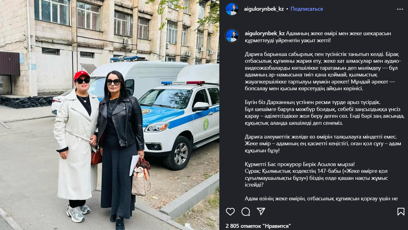 Она также подчеркнула, что Дарига не обязана обсуждать свою личную жизнь в социальных сетях, а вмешательство в частное пространство любого человека является нарушением конституционных прав.