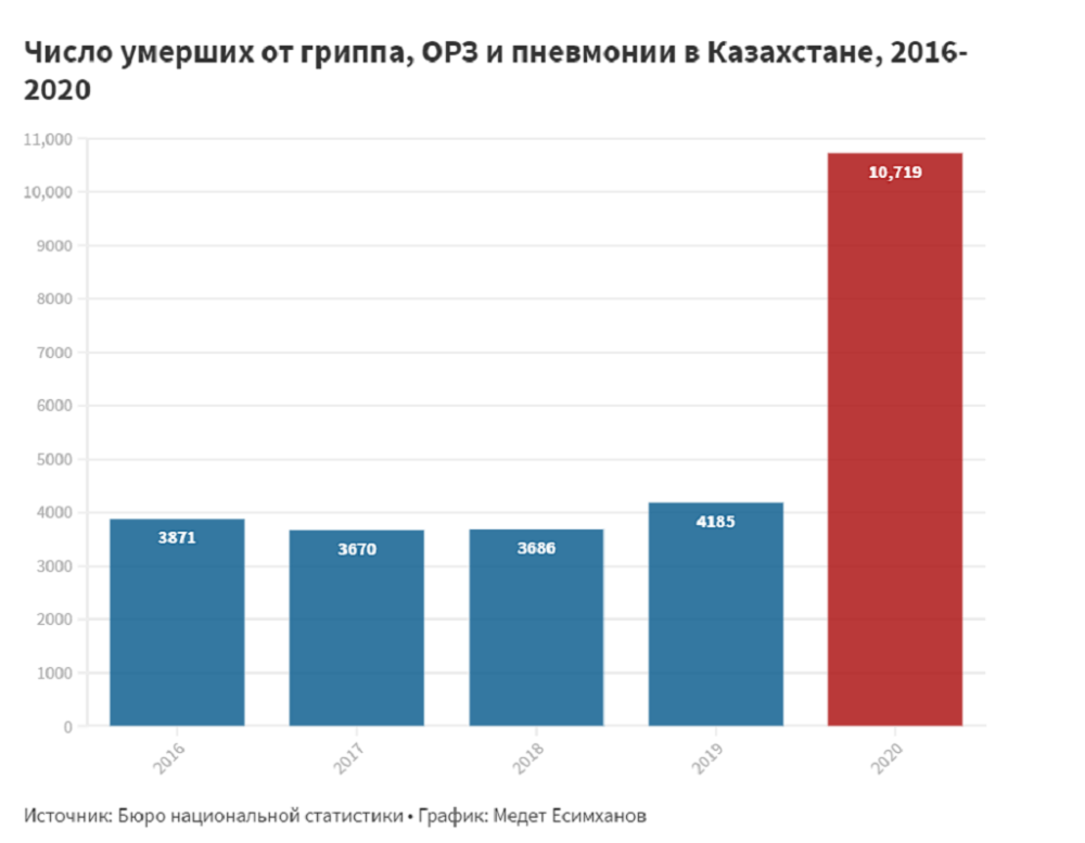 Оказалось, что в 2020 году смертность от гриппа, ОРЗ и пневмонии выросла в 2,5 раза, по сравнению с 2019 годом. До появления коронавируса от болезней данной категории ежегодно умирало порядка четырех тысяч казахстанцев. В 2020 году этот показатель достиг 10 тысяч смертей.
