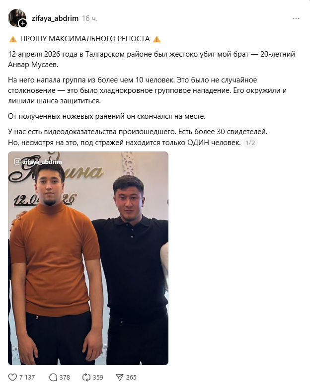 По словам казахстанки, трагедия произошла 12 апреля в Талгарском районе. Сообщается, что на Анвара Мусаева “напала группа из более чем 10 человек”.