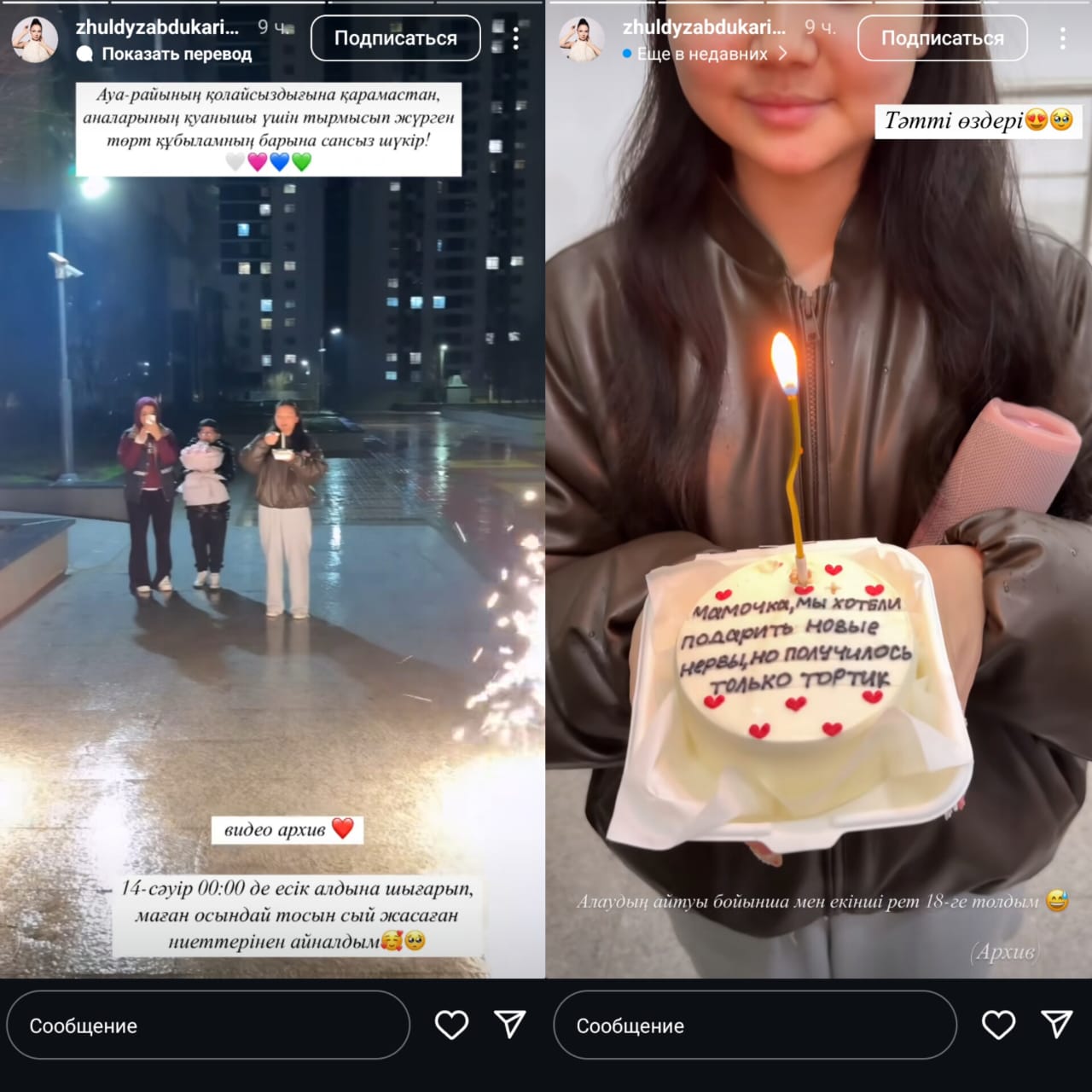 По словам Жулдыз, ровно в полночь ее первыми поздравили дети. В подписи к видео она написала: