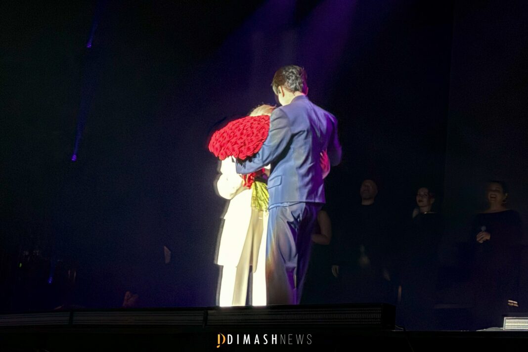 Димаш поздравил Лару Фабиан с великолепным концертом и вручил большой букет алых роз.