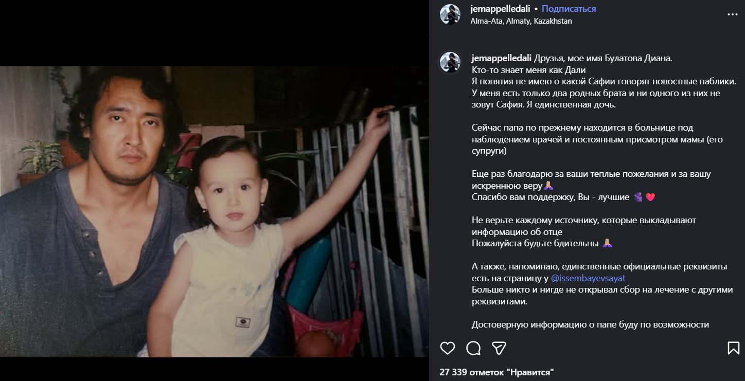 Дочь актера предостерегла поклонников от недостоверных источников и подчеркнула, что единственные официальные реквизиты для сбора средств на лечение находятся на странице актера, друга семьи Саята Исембаева, и других официальных сборов не существует.