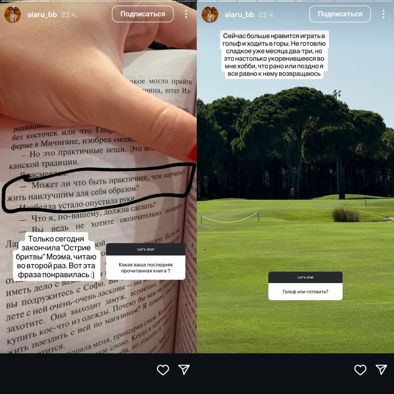 Один из подписчиков поинтересовался, какую книгу Айару читает сейчас. Она призналась, что уже в который раз перечитывает роман Сомерсета Моэма “Острие бритвы”. Особенное впечатление на нее произвела одна из цитат произведения: