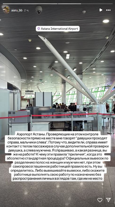 По словам Айару, сотрудники досмотра просят пассажиров проходить в разные стороны в зависимости от пола, ссылаясь на неформальные правила.
