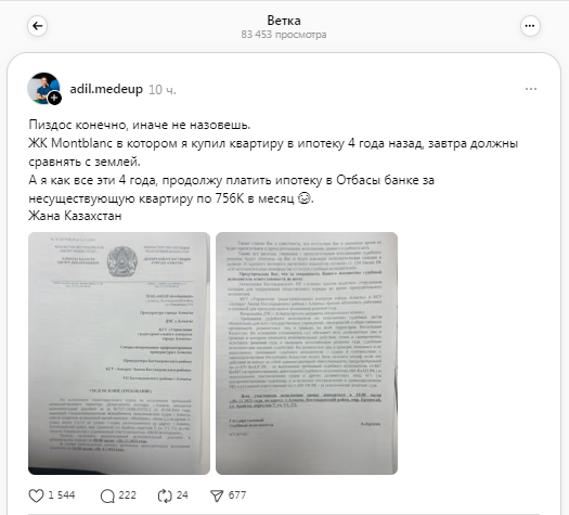 "ЖК Montblanc в котором я купил квартиру в ипотеку 4 года назад, завтра должны сравнять с землей. А я как все эти 4 года, продолжу платить ипотеку в Отбасы банке за несуществующую квартиру по 756К в месяц", — написал пользователь.