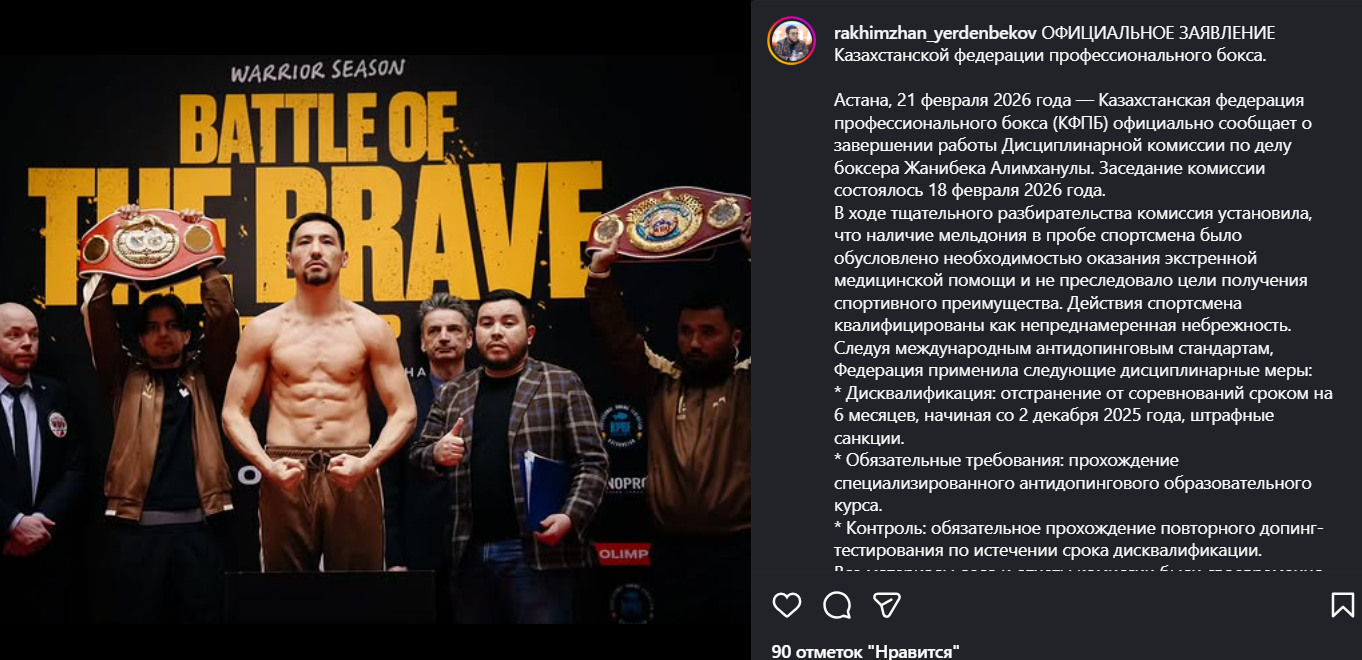 Казахстанская федерация профессионального бокса (КФПБ) официально объявила о завершении работы дисциплинарной комиссии по делу боксера Жанибек Алимханулы. Заседание комиссии прошло 18 февраля 2026 года, передает Liter.kz.