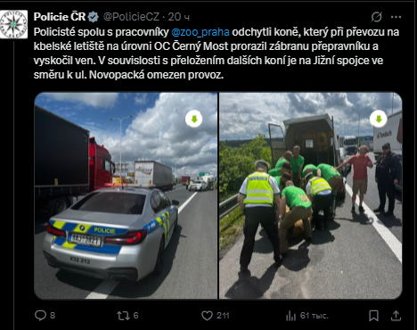 "Во время поездки по кольцевой дороге в районе Černý Most один из жеребцов выбил двери прицепа и выпрыгнул на проезжую часть на скорости 40 км/ч. В результате произошедшего ни лошадь, ни люди не пострадали, но инцидент привел к блокировке движения, как по кольцевой дороге, так и по Южной соединительной магистрали, где образовались многокилометровые пробки", — говорится в сообщении.