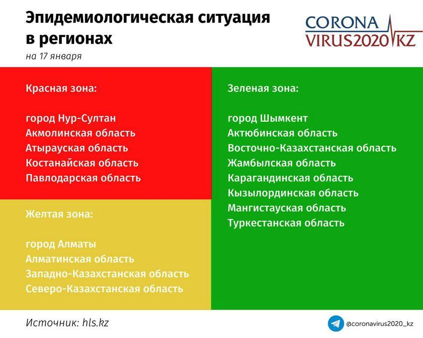 В «желтой зоне» сейчас остаются Алматы, Алматинская, Западно-Казахстанская и Северо-Казахстанская области. Другие регионы пребывают в «зеленой зоне».