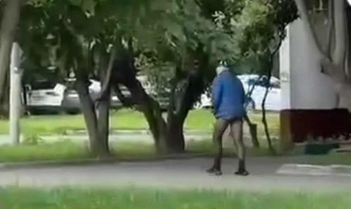 На видеозаписи запечатлен мужчина преклонного возраста в синей куртке и без штанов. Вместо брюк на нем надеты черные полупрозрачные женские капроновые колготки.