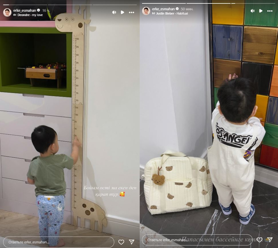На одном из кадров Ислам стоит у ростомера – будто проверяет, насколько подрос, а на другом собирается в бассейн вместе с папой.