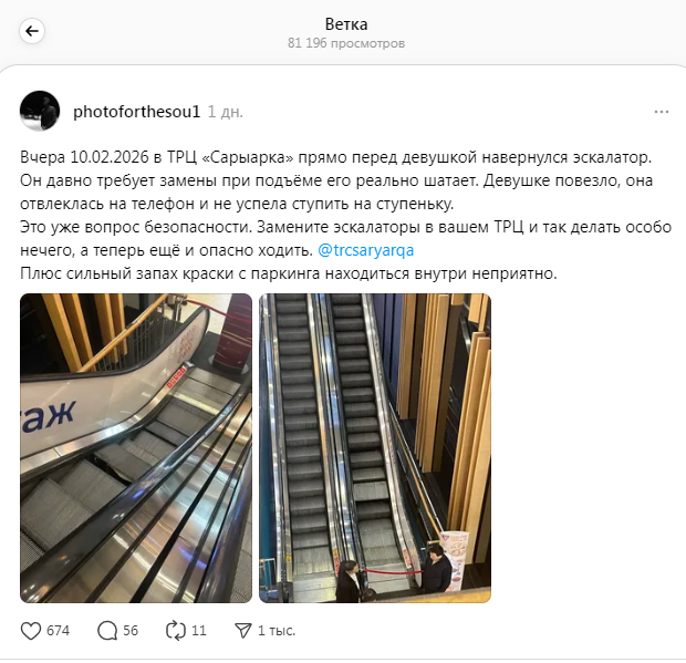 Астанчане призвали руководство ТРЦ обратить внимание на состояние оборудования и заменить эскалаторы, чтобы избежать возможных травм.