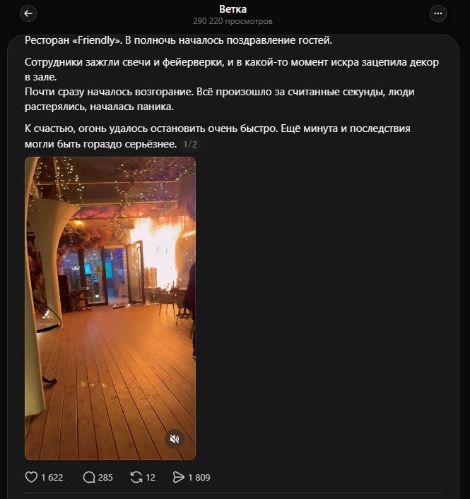 Очевидец утверждает, что в какой-то момент искра попала на элементы декора в зале, после чего началось быстрое возгорание. По его словам, ситуация развивалась стремительно и вызвала панику среди присутствующих.