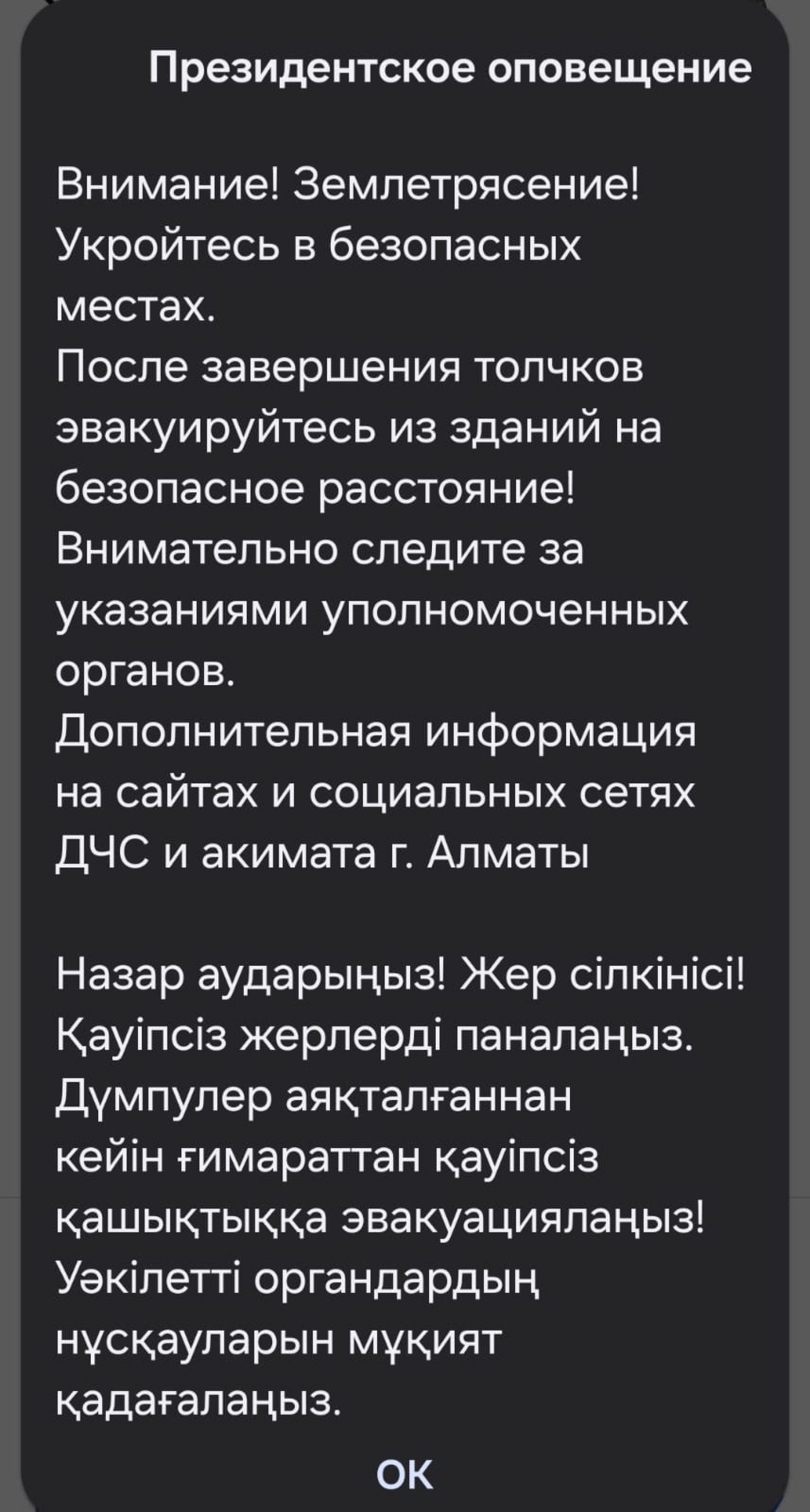 Фейк или сбой: алматинцам пришло "президентское оповещение" о землетрясении