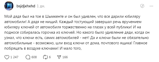 "Мой дядя был на тое, и он был удивлен, что все дарили юбиляру автомобили! А дядя не нищий. Каждый тостующий завершал речь вручением юбиляру ключей от автомобиля торжественно на глазах у всей публики! И на подносе собиралась горочка из ключей. Но какого было удивление дяди, когда он узнал, что ключи есть, самих автомобилей — нет! Да и ключи были не обязательно автомобильные — возможно, ключи от дома, почтового ящика! Главное – побряцать в воздухе ключами! И мало того, этот цирк был согласован с юбиляром! Это было пожелание юбиляра, чтобы выглядеть более статусно. То есть психологически мог пострадать только от всего происходящего мой дядя и гости из других городов! Остальные, местные, привыкшие к этому, так сказали дяде. Может, жители Шымкента развенчают этот миф, и сейчас такое уже не происходит?! Но этот случай реальный", — написала пользователь соцсети.